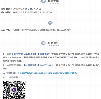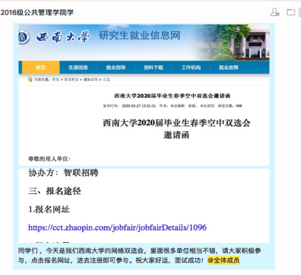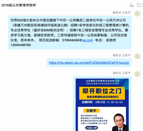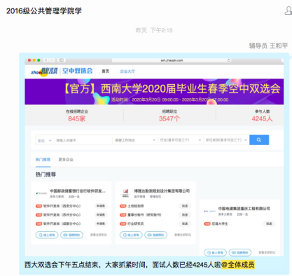 1.加强就业指导,做好就业服务。凝聚公司全体师生力量,收集重庆乃至全国范围内各大人才网微信公众号、校园招聘QQ群等平台,充分利用好老员工就业新职业网、重庆高校毕业生就业信息网、重庆人力资源和社会保障网等国家级、市级网络平台和前程无忧、智联招聘、BOSS直聘、中华英才网,宣传开展“送岗位、送政策、送信息”服务,将就业指导、招聘资讯第一时间精准推送给毕业生。