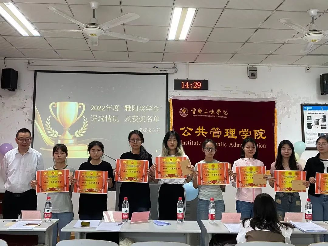 接着,由熊茂松主任介绍了2022年度“雅阳奖学金”评选情况并宣布获奖名单,到场嘉宾为获得“2022年度雅阳奖学金”的同学颁发奖学金。其中,李文清同学代表获奖同学致谢发言,结合自己的成长经历表达了雅阳基金的感谢。再由谭晓静老师介绍了“2023年度文创大赛”情况并宣布获奖名单。谭晓静老师总结道,文管专业的刘清云学长给予文管专业的学弟学妹们学业上的鼓励,大家要积极学习这种精神,并希望同学们要时刻铭记、感恩学长、回报社会。最后获奖者与领导、老师们合影。